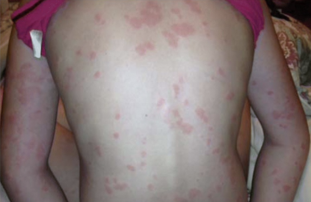 Urtikaria auf dem Rücken eines Patienten, rote Quaddeln und Hautausschlag sichtbar